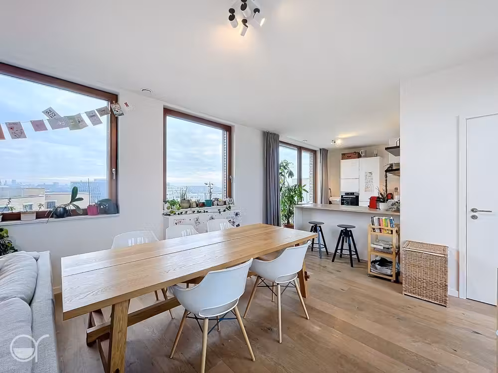 Deze unieke penthouse is gelegen op de 5de verdieping van een recente bouw op de Gasmeterlaan. Dankzij de hoogte geniet het appartement over een prachtig uitzicht via het rondom gelegen terras alsook van stilte en veel lichtinval. Het appartement beschikt over veel en grote ruiten langs beide kanten een ruime inkomhal, een apart toilet, twee bergingen met mogelijkheid tot aansluiting van een wasmachine, drie slaapkamers waarvan de grootste toegang geeft tot het eerste van de maar liefst drie terrassen, een badkamer met dubbele lavabo, toilet en keuze tussen een bad als een douche, een ruime leefruimte met ook hier toegang tot een terras met zicht over water, een half open keuken ingericht met A-merk toestellen en opnieuw toegang tot een terras met zicht over de Gentse binnenstad. Dit laatste terras beschikt ook over een buitenberging. Staanplaats is inbegrepen in de huurprijs.