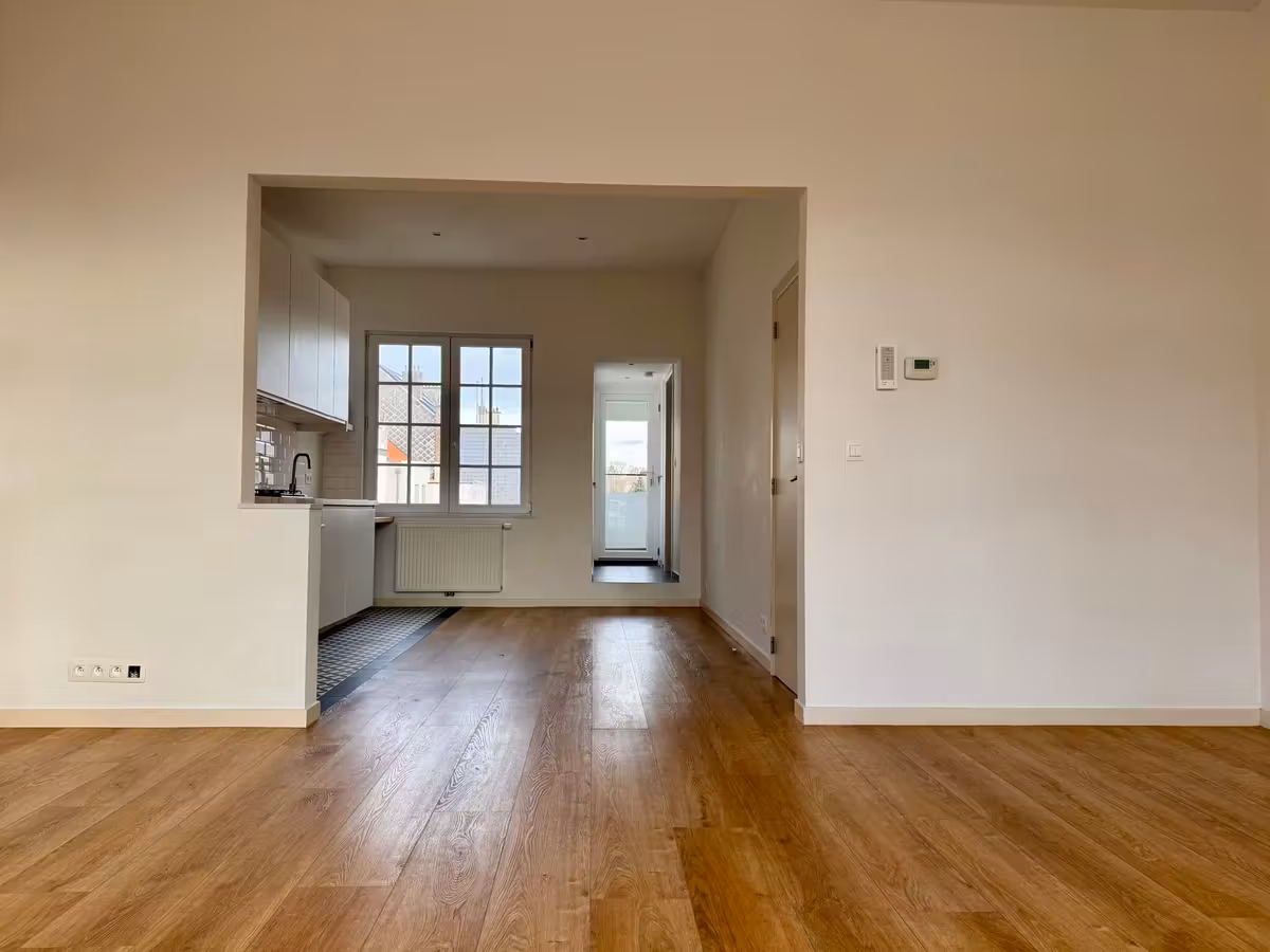 In Laken, nabij het Brugmannziekenhuis, in de Léopoldwijk, op de 2e verdieping, een charmant 86 m² triplex appartement met een terras van ongeveer 11 m². Beschrijving: Inkomhal - Woonkamer van ongeveer 23 m² met open keuken van ongeveer 15 m² (gaskookplaat, oven, dampkap, vaatwasser, spoelbak). GEEN KOELKAST. Toegang tot het terras. Doucheruimte, gastentoilet. Boven: 2 slaapkamers van ongeveer 14 m² en 13 m², laminaatvloer. Badkamer (bad/douche, wastafelmeubel), apart toilet, betegelde vloer. Zolder slaapkamer/kantoor van ongeveer 11 m², laminaatvloer. Dicht bij alle voorzieningen: openbaar vervoer, hoofdwegen, scholen, groene ruimtes, winkels.